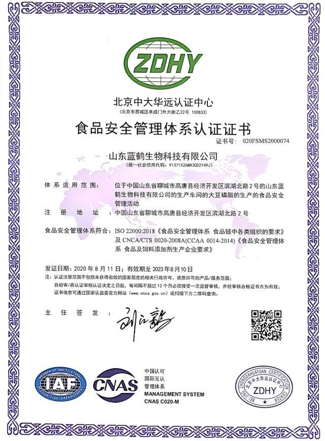 我们山东蓝鹤生物科技有限公司完成了新一轮 ISO22000的认证。